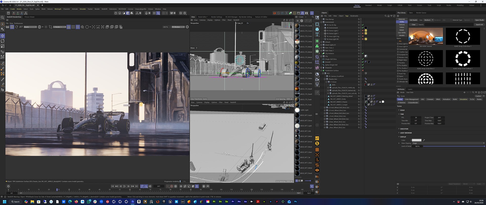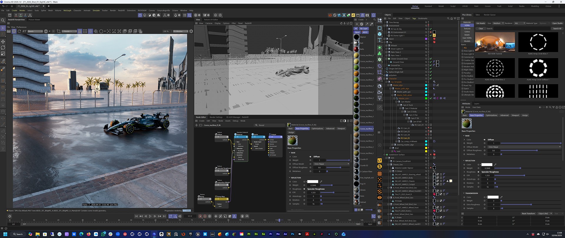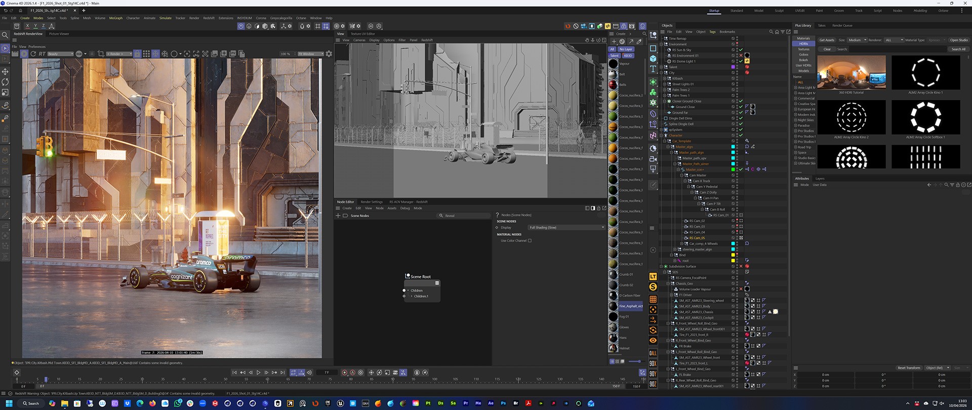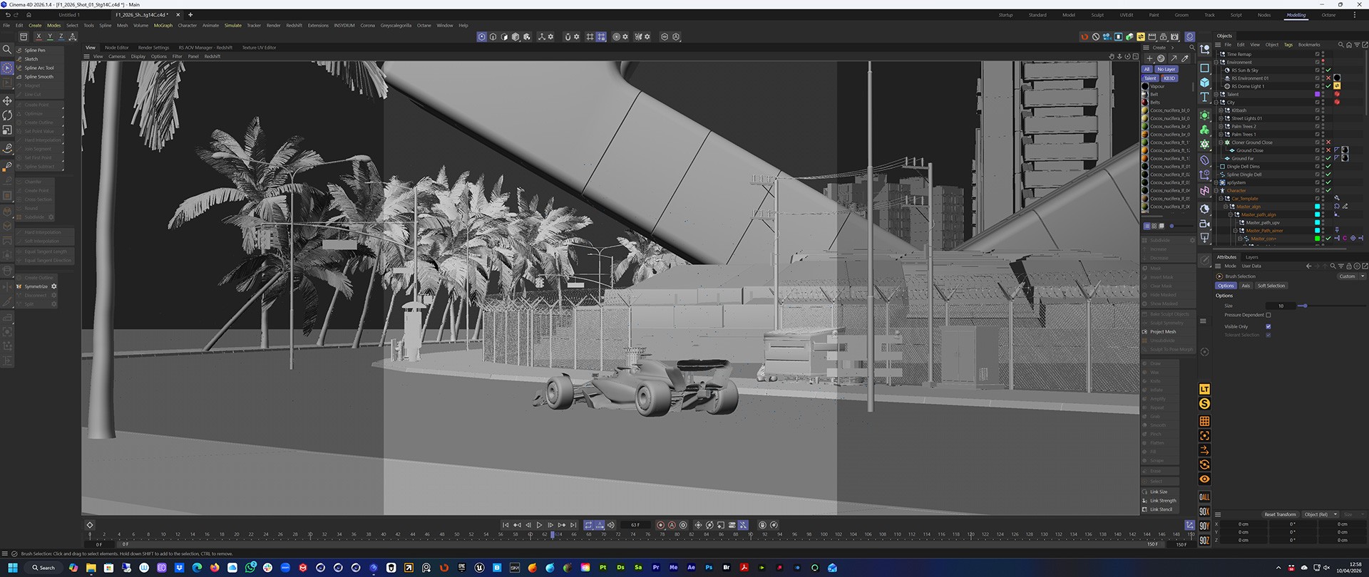 First task was to re-work the F1 car and driver for Redshift and then I set the model to work with C4D's Character animation rig. That gave me full control over the motion of the car without having to worry about wheels rotating or turning.