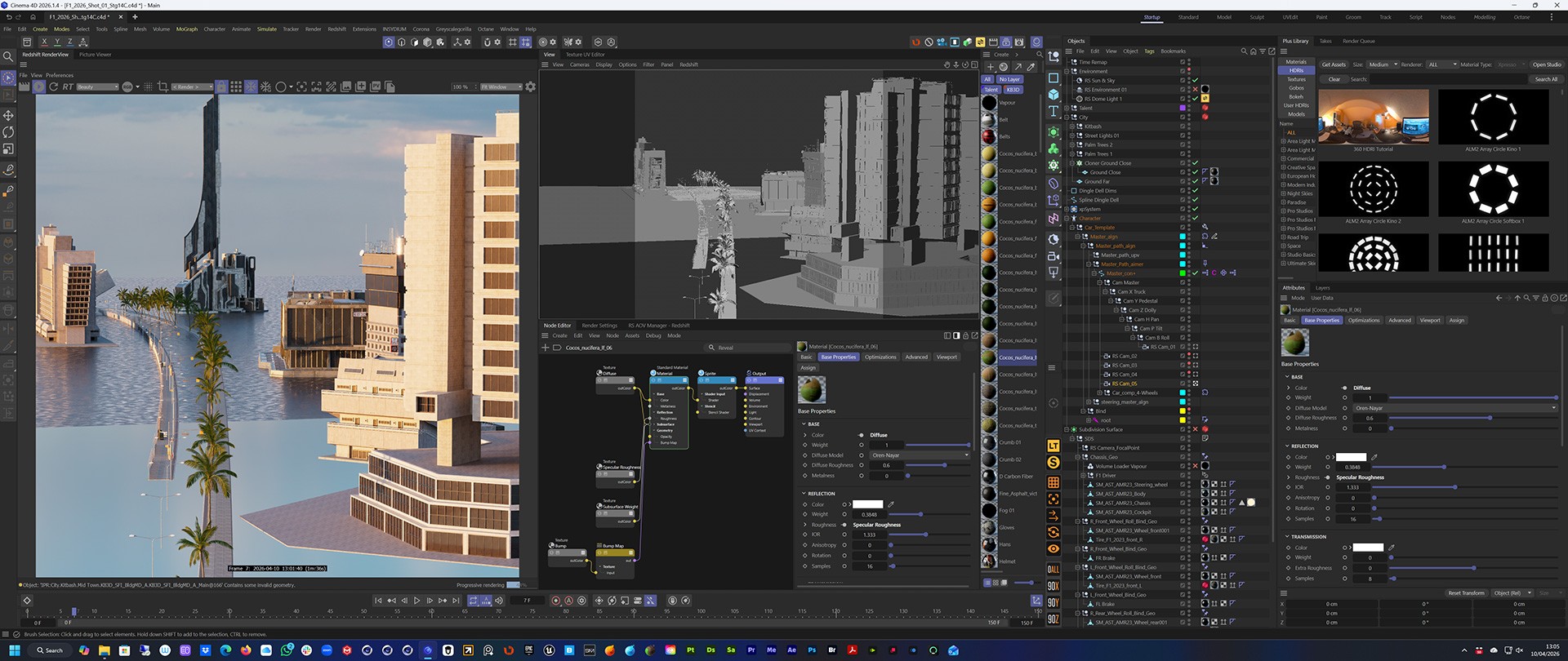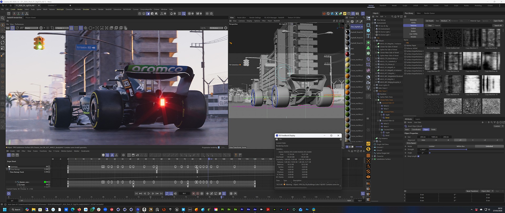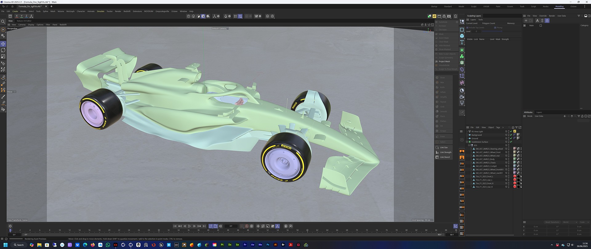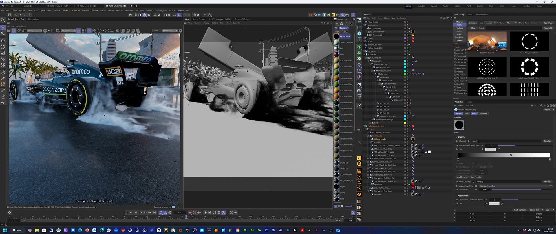 First task was to re-work the F1 car and driver for Redshift and then I set the model to work with C4D's Character animation rig. That gave me full control over the motion of the car without having to worry about wheels rotating or turning.